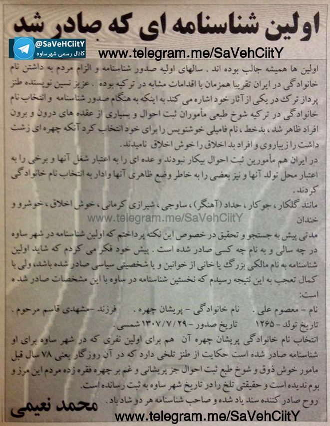 اولین شناسامه نام ونام خانوادگی در ساوه معصوم علی پریشان چهره 29 مهر 1308 شمسی