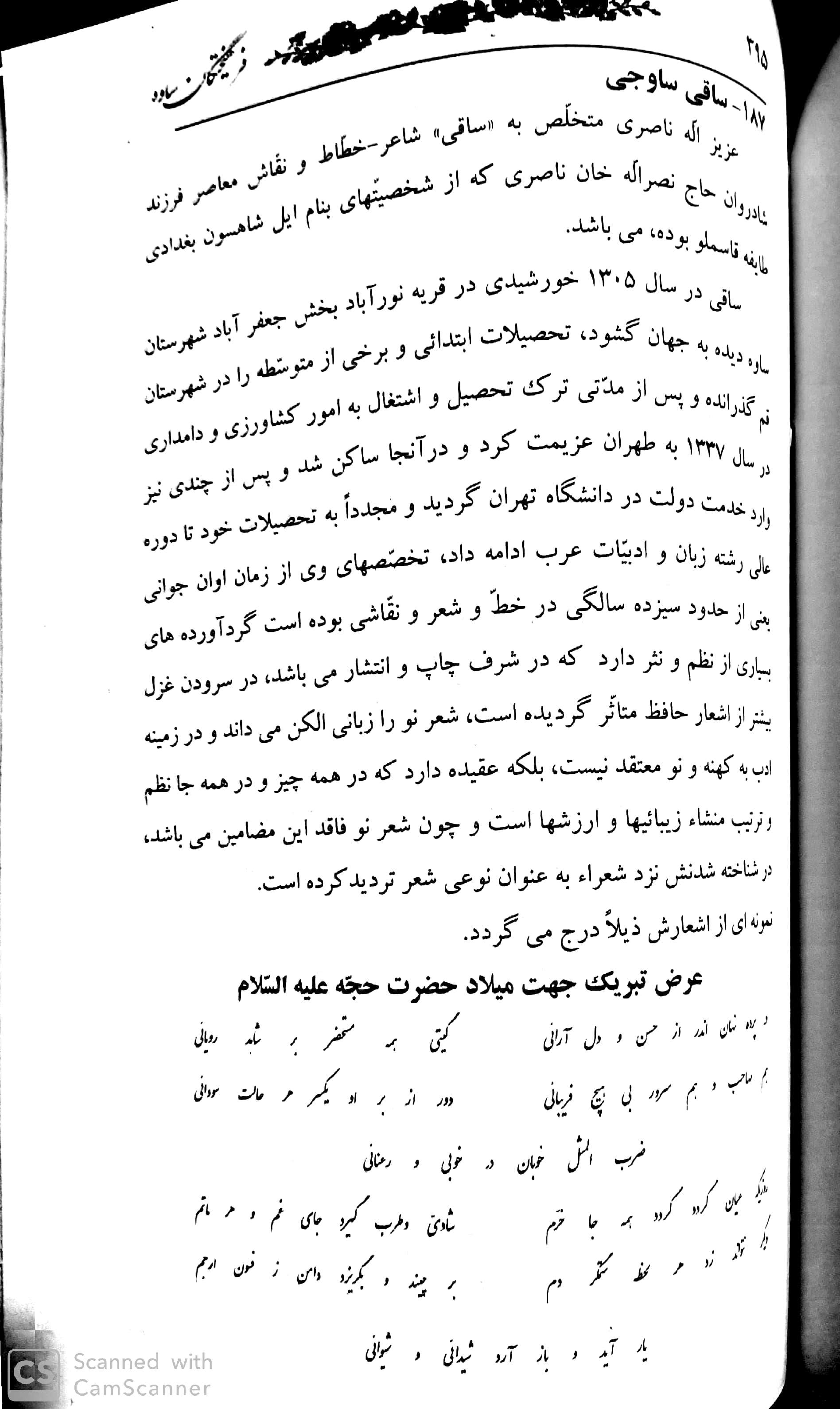 عزیز اله ناصری ساوجی متخلص به (ساقی) شاعر - خطاط ونقاش ایل شاهسوند بغدادی طایفه قاسملو