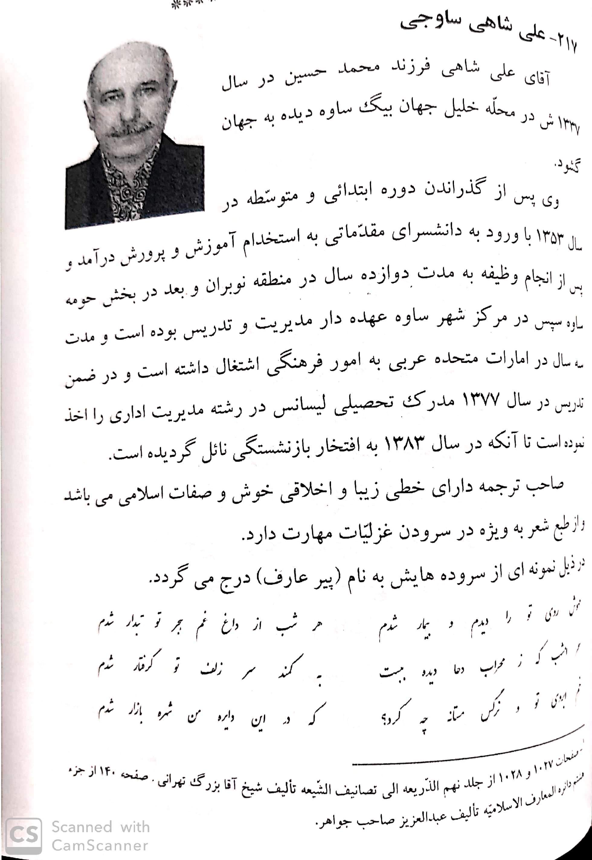 آقای علی شاهی فرزند محمد حسین درسال 1337 ش در محله خلیل جهان بیک ساوه ای (پیر عارف) سروده ها دارد