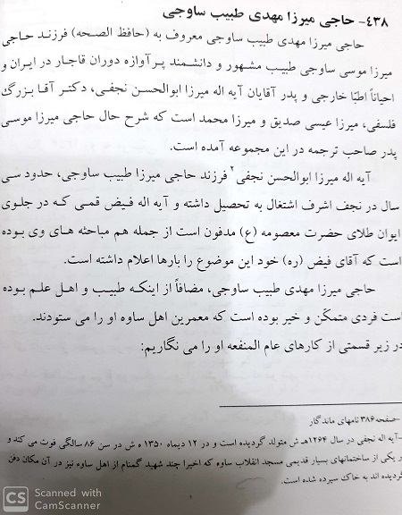 حاجی میرزا مهدی طبیب ساوجی مضافا از اینکه طبیب واهل علم بوده است فردی متمکن وخیر بوده است که معمرین اهل ساوه اورامی ستودند