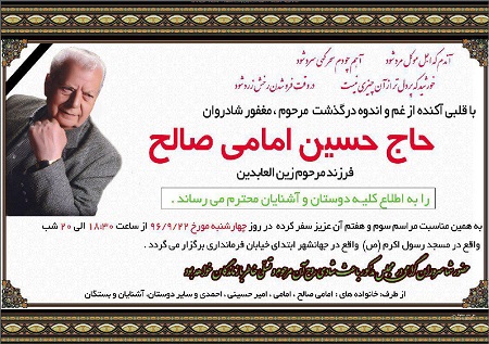 مرحوم حاج حسین امامی صالح ساوجی فرزند زین العابدبین فرزند شیخ مهدی (امام جمعه ساوه ) فرزند حاح شکرالله فرزتد حاج میرزاتقی بزرگ فرزند حاح حسن فرزند حاج باب علی امامی کاشانی ..شغل ارتشی ساکن کرج